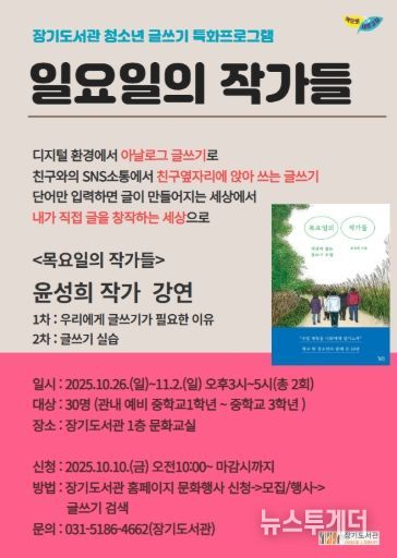 뉴스투게더 김인숙 기자 | 김포시 장기도서관은 청소년 글쓰기 특화프로그램으로 '일요일의 작가들'을 오는 10월 26일, 11월 2일 오후 3시부터 5시까지 장기도서관 1층 문화교실에서 운영한다고 밝혔다
