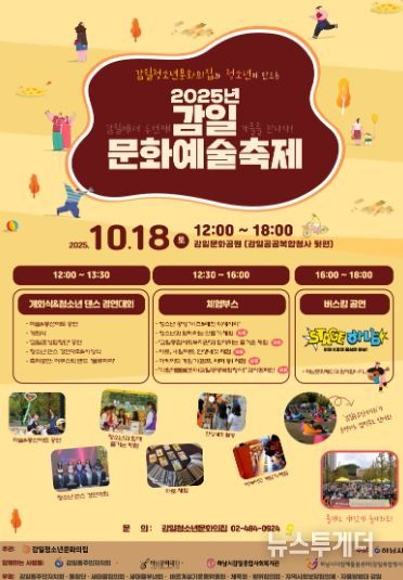 뉴스투게더 김인숙 기자 | 하남시 감일청소년문화의집은 오는 10월 18일 오후 12시부터 18시까지 감일문화공원(감일공공복합청사 뒷편)에서 '제2회 감일문화예술축제'를 개최한다.
