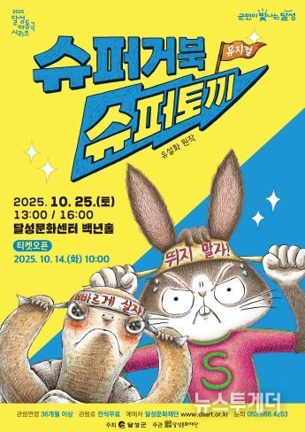 뉴스투게더 김인숙 기자 | 달성문화재단은 오는 25일 오후 1시와 4시, 달성문화센터 백년홀에서 ‘2025 달성 아동극 시리즈’의 다섯 번째 공연 ‘슈퍼거북 슈퍼토끼’를 개최한다고 밝혔다.