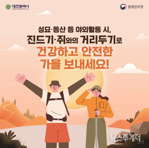 뉴스투게더 김인숙 기자 | 대전시는 성묘와 등산, 농작업 등 야외활동이 늘어나는 가을철을 맞아 시민들에게 진드기·설치류 매개 감염병 예방수칙 준수를 당부했다.