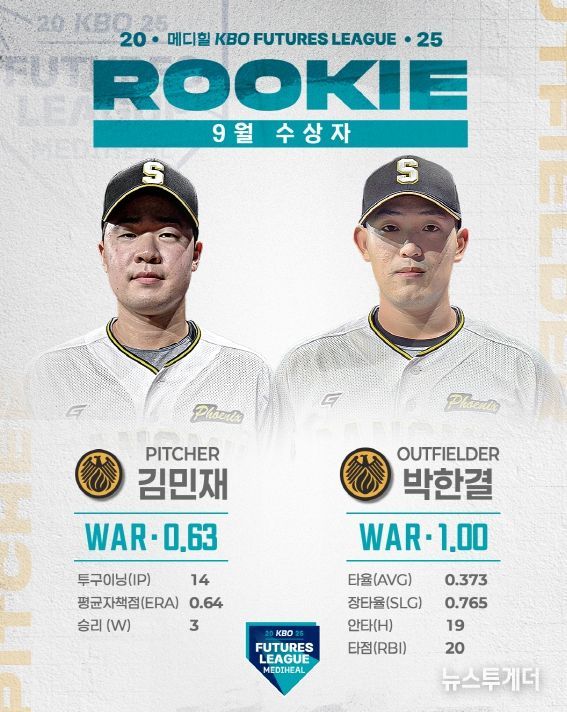 뉴스투게더 윤종우 기자 | 2025 메디힐 KBO 퓨처스리그의 9월 퓨처스 루키상 수상자로 투수 부문에는 상무 김민재가 WAR 0.63, 타자 부문에는 상무 박한결이 WAR 1.00을 기록하며 각각 선정됐다.