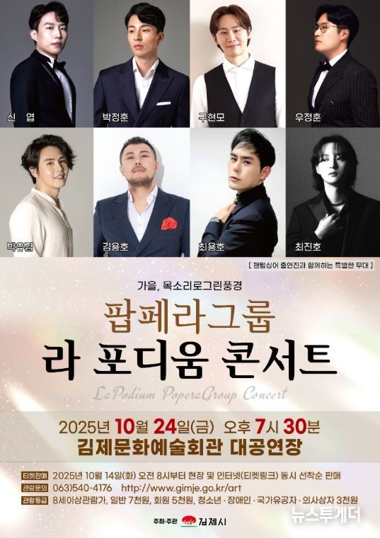 뉴스투게더 김인숙 기자 | 깊어 가는 가을, 특별한 음악의 향연 팝페라 그룹'라 포디움 콘서트'가 오는 24일 오후 7시 30분 김제문화예술회관 대공연장에서 펼쳐진다.