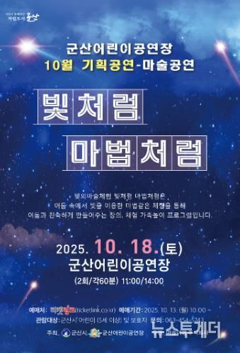 뉴스투게더 김인숙 기자 | 군산어린이공연장이 오는 10월 18일 어린이들의 상상력과 창의력을 자극하는 특별한 체험형 공연 '빛처럼 마법처럼'을 선보인다.
