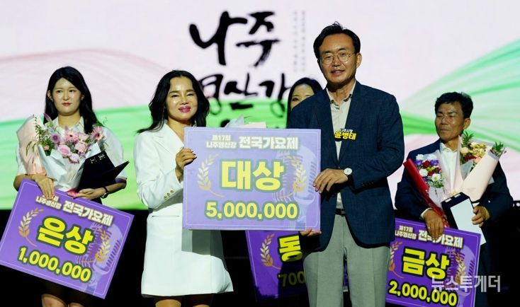뉴스투게더 김인숙 기자 | ‘2025 나주영산강축제’ 국민참여 프로그램중 하나인 ‘제17회 나주 영산강 전국 가요제’에서 천년학(김용림)을 열창한 장성희 씨(광주광역시)가 영예의 대상을 차지해 부상으로 상금 500만 원을 수여 받았다.
