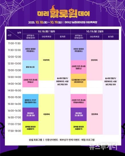마이산 북부 야외족욕장에서는 매월 새로운 주제로 다양한 이벤트를 선보이고 있으며 이번 10월 특별 행사는 할로윈 데이를 주제로 △할로윈 코스튬 대회 △어린이 쿠킹클래스 △신비한 키즈 콘서트(마술&버블쇼) △할로윈 타로체험 등 다채로운 프로그램이 마련된다. 행사는 양일간 오전 11시부터 오후 6시까지 진행되며 일부 행사는 SNS 등을 활용해 사전 신청을 받아 운영된다.