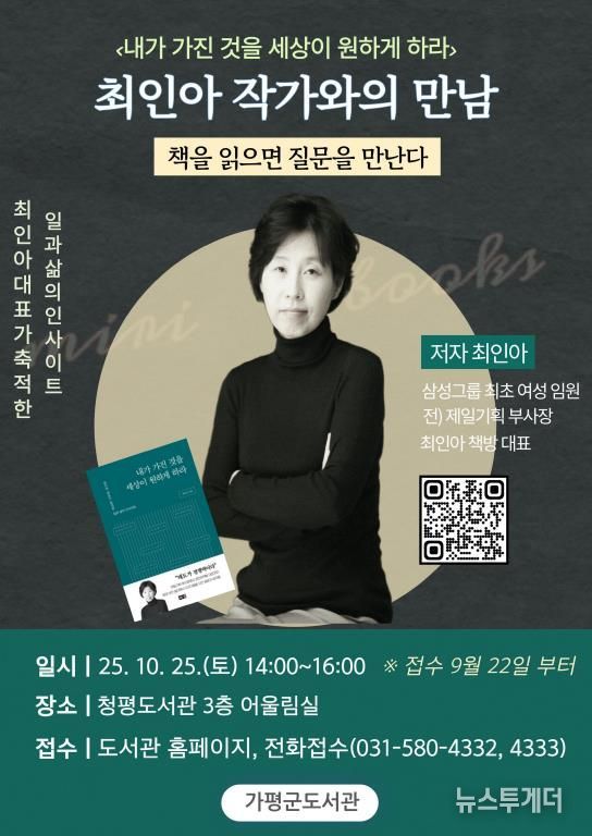뉴스투게더 김인숙 기자 | 가평군은 이달 25일 오후 2시 청평도서관에서 ‘2025년 정기 작가와의 만남’ 강연을 개최한다. 이번 강연은 ‘최인아 책방’ 대표로 잘 알려진 최인아 작가를 초청해 ‘책을 읽으면 질문을 만난다’를 주제로 열린다.