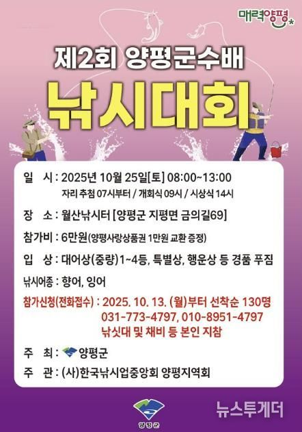 뉴스투게더 김인숙 기자 | 양평군은 오는 25일 관내 월산낚시터에서 ‘제2회 양평군수배 낚시 대회’를 개최한다고 밝혔다.