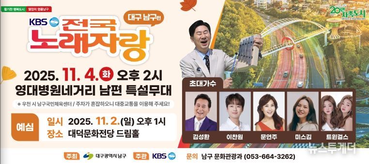 뉴스투게더 김인숙 기자 | 대구 남구는 국내 최장수 인기 프로그램인 KBS 전국 노래자랑 ‘대구 남구편’이 오는 11월 4일 오후 2시, 영대병원네거리 남편 특설무대에서 열린다고 밝혔다.