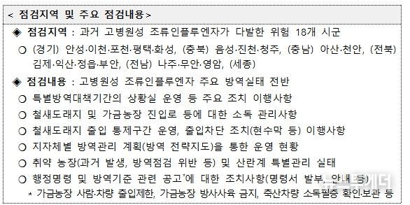 이번 점검은 지난 9월 12일 경기도 파주에서 과거보다 다소 이른 시기에 고병원성 조류인플루엔자가 가금농장에서 발생했고, 10월부터 겨울 철새가 본격 도래하면서 국내 추가 발생 가능성이 높아짐에 따라 선제적으로 농식품부, 행정안전부, 농림축산검역본부, 시도 관계관 합동으로 점검반을 구성하여 실시하는 것이다.