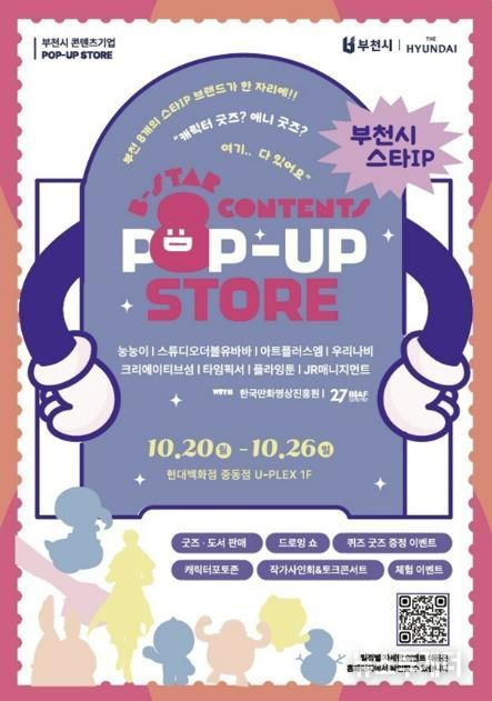 뉴스투게더 김인숙 기자 | 부천시는 10월 20일부터 26일까지 현대백화점 중동점 U-PLEX 1층에서 지역 우수 콘텐츠 기업 8개 사가 참여하는 팝업스토어 ‘8 CONTENTS, ONE STAGE in BUCHEON’을 운영한다.