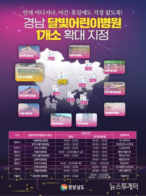 뉴스투게더 김인숙 기자 | 경상남도는 소아 야간·휴일 진료 사각지대 해소를 위해 진주시에 ‘달빛어린이병원’을 신규 지정하고, 10월 20일부터 운영한다.