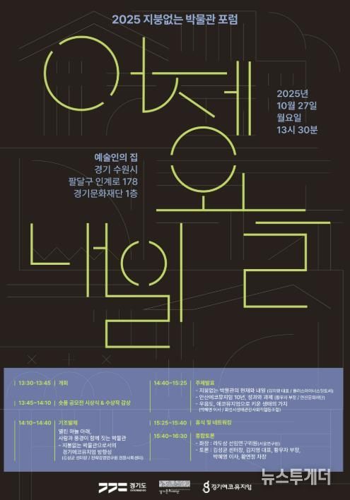 뉴스투게더 김인숙 기자 | 경기도와 경기문화재단은 일상 곳곳의 발자취를 ‘박물관’으로 만드는 지붕없는 박물관(경기에코뮤지엄)사업의 '2025 지붕없는 박물관 포럼_어제·오늘·내일'을 10월 27일 오후 1시 30분 경기문화재단 예술인의 집(수원)에서 개최한다.