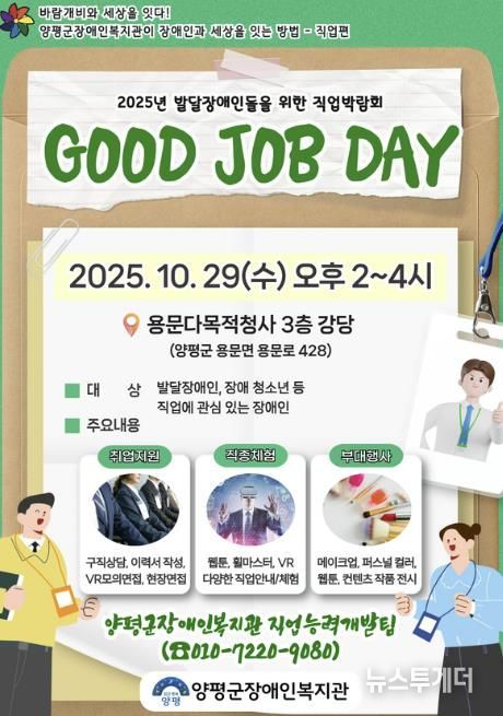 뉴스투게더 김인숙 기자 | 대한불교조계종사회복지재단이 운영하는 양평군장애인복지관은 오는 29일 오후 2시부터 4시까지 용문다목적청사 3층 강당에서 발달장애인의 직업 탐색 기회를 지원하기 위한 직업박람회 ‘GOOD JOB DAY’를 개최한다.