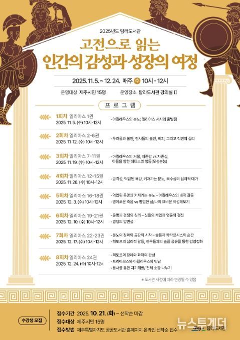 뉴스투게더 김인숙 기자 | 제주시 탐라도서관은 고대 그리스 서사시 ‘일리아스’를 활용한 ‘고전으로 읽는 인간의 감성과 성장의 여정’ 프로그램 참여자를 모집한다.