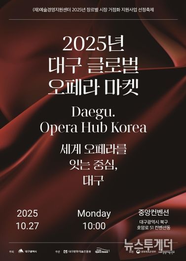 뉴스투게더 김인숙 기자 | (재)대구문화예술진흥원 대구오페라하우스는 문화체육관광부와 예술경영지원센터가 추진하는‘2025 장르별 시장 거점화 지원사업’에 선정돼, 오는 10월 27일 중앙컨벤션홀(대구 북구 호암로 51)에서 ‘2025 대구 글로벌 오페라 마켓’을 개최한다.