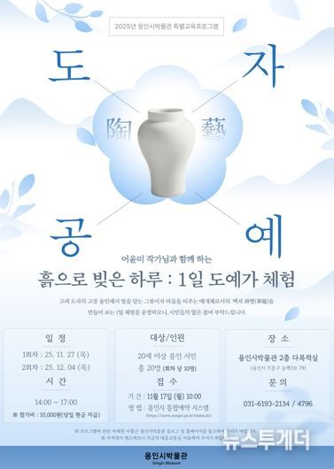 뉴스투게더 김인숙 기자 | 용인특례시는 11월 27일부터 12월 4일까지 용인시박물관에서 매주 목요일 오후 2~5시 두 차례에 걸쳐 ‘흙으로 빚은 하루 : 1일 도예가 체험’을 운영한다고 9일 밝혔다.