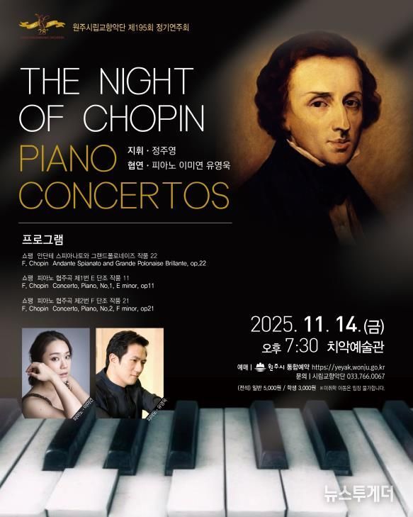 뉴스투게더 장영주 기자 | 원주시립교향악단은 오는 14일 오후 7시 30분, 치악예술관에서 제195회 정기연주회 ‘The Night of CHOPIN’을 개최한다.