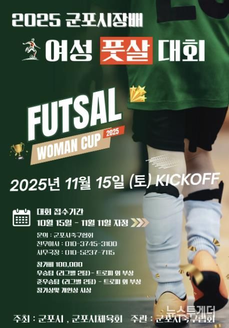 뉴스투게더 김인숙 기자 | 군포시는 여성 생활체육 참여 확대와 건전한 스포츠 문화 확산을 위해 ‘2025 군포시장배 여성 풋살대회’를 오는 11월 15일(토) 군포시 국민체육센터 축구장에서 개최한다.