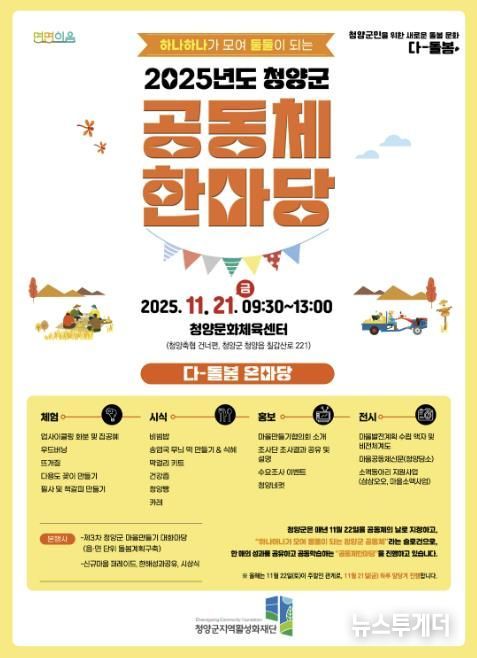 뉴스투게더 김인숙 기자 | 청양군지역활성화재단은 지역 공동체 발전을 위한 한 해의 성과를 공유하고 상호 학습을 통해 지속 가능한 발전을 도모하기 위해 ‘2025 청양군 공동체한마당’을 개최한다.