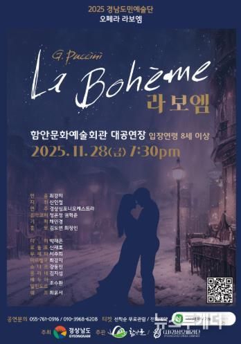 뉴스투게더 김인숙 기자 | 함안군은 푸치니의 대표작 오페라 〈라 보엠〉을 오는 2025년 11월 28일 오후 7시 30분, 함안문화예술회관 대공연장에서 전석 무료로 선보인다고 밝혔다.
