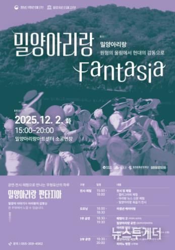 뉴스투게더 김인숙 기자 | 경남 밀양시는 오는 12월 2일 오후 3시부터 8시까지 밀양아리랑아트센터 소공연장과 전수관에서 ‘2025 밀양아리랑 판타지아’를 개최한다.
