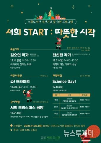 뉴스투게더 김인숙 기자 | 이천시 서희도서관은 개관을 기념하고 한 해를 마무리하는 송년 행사로, 시민들과 함께하는 문화예술과학 프로그램인 ‘서희 START : 따뜻한 시작’을 12월 한 달간 운영한다고 밝혔다.