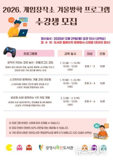 교육과정은 2026년 1월 12일부터 2월 5일까지 운영하며, ▲‘생각이 자라는 코딩놀이: 언플러그드 코딩’ ▲‘스크래치와 함께하는 겨울 코딩 대모험’ ▲‘생성형 AI와 함께하는 VR 게임 개발’ 등 총 3개 과정으로 진행한다.