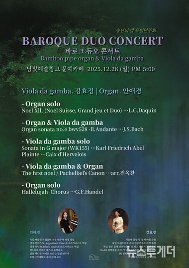 뉴스투게더 김인숙 기자 | 담양군문화재단은 오는 28일 오후 5시 담빛예술창고 문예카페에서 『2025 담빛예술창고 송년특별연주회 ‘바로크 듀오 콘서트’』를 진행한다고 밝혔다.