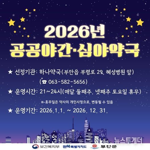 뉴스투게더 김인숙 기자 | 부안군은 2026년에도 군민들의 건강 보호 강화를 위해 공공심야약국을 운영한다고 발표했다.