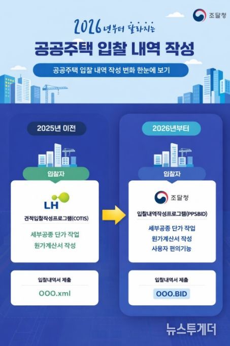 뉴스투게더 김태훈 기자 | 조달청은 2026년부터 LH 공공주택 입찰 시 내역서를 ‘조달청 입찰내역작성프로그램’을 이용하여 작성해야 한다고 밝혔다.