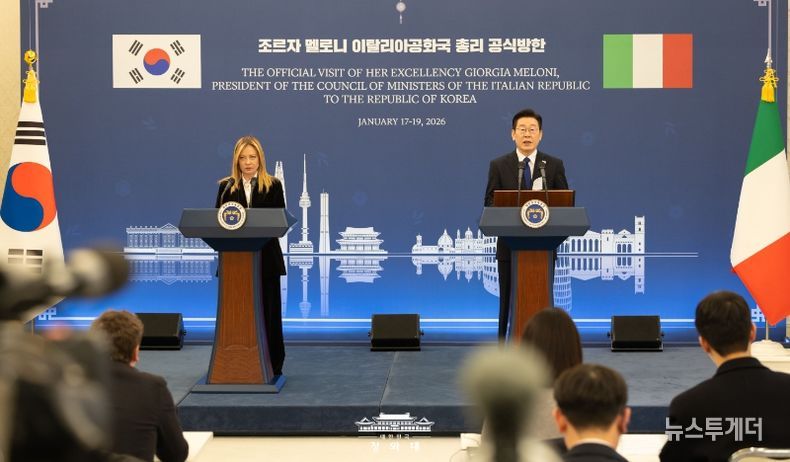 뉴스투게더 김태훈 기자 | 이재명 대통령은 19일 조르자 멜로니 이탈리아 총리와의 정상회담 뒤 "저와 멜로니 총리는 전략적 동반자 명칭에 부합하는 미래지향적 수준으로 양국 관계를 더욱 발전시켜 나가기로 합의했다"고 밝혔다.