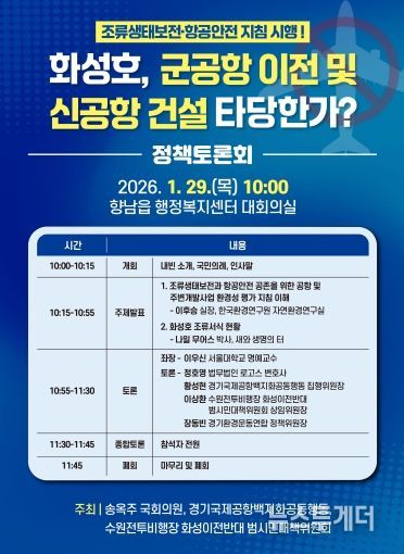 한편, '‘조류생태보전·항공안전 지침 시행!’ 화성호, 군공항 이전 및 신공항 건설 타당한가' 정책토론회는 1월 29일 오전 10시, 화성시 향남읍 행정복지센터 대회의실에서 열린다.