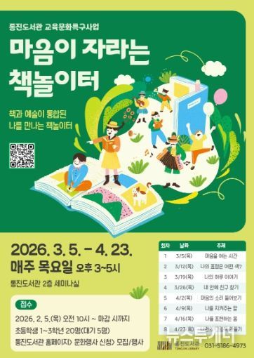 마음이 자라는 책놀이터 상반기 프로그램은 3월 5일부터 4월 23일까지, 매주 목요일 오후 3~5시 총 8회에 걸쳐 진행된다. 모집 대상은 초등학생 1~3학년 20명이며, 참여 신청은 2월 5일 오전 10시부터 통진도서관 누리집 문화행사 신청' 모집/행사에서 선착순으로 접수한다.