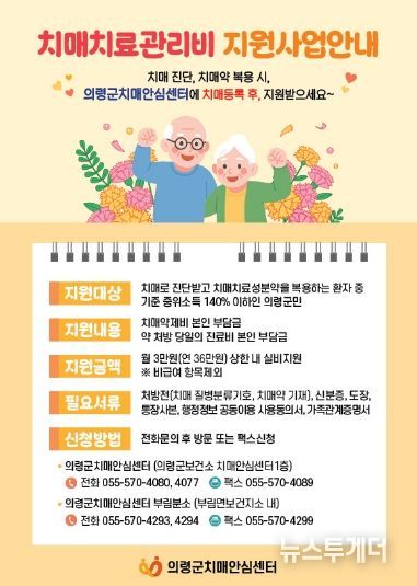 뉴스투게더 김인숙 기자 | 의령군은 치매치료관리비 지원사업의 대상자 선정 기준을 개선해 지원 대상을 확대한다고 밝혔다.