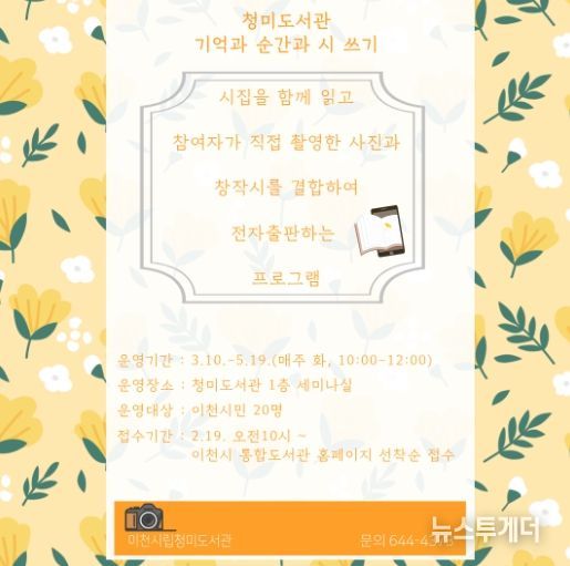 뉴스투게더 김인숙 기자 | 이천시 청미도서관은 시민들이 직접 찍은 사진으로 시를 쓰고 전자책을 출판하는 ‘기억과 순간과 시 쓰기’ 프로그램을 운영한다.