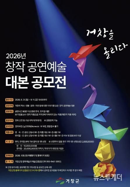 뉴스투게더 김인숙 기자 | 거창군은 거창의 이야기와 정체성을 담은 공연콘텐츠 발굴을 위해 2026년 창작 공연예술 대본 공모전, ‘거창을 올리다’를 개최한다고 4일 밝혔다.