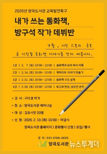 뉴스투게더 김인숙 기자 | 김포시 양곡도서관은 오는 3월 7일부터 3월 28일까지 매주 토요일, 시민을 대상으로 한 그림책 글쓰기 수업 '내가 쓰는 동화책, 방구석 작가 데뷔반'을 운영한다.