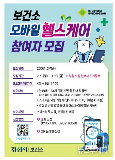 뉴스투게더 김인숙 기자 | 경산시는 ICT 기술을 활용해 시민의 생활 습관을 개선하는‘2026년 모바일 헬스케어 사업’ 참여자 200명을 오는 9일부터 모집한다고 밝혔다.