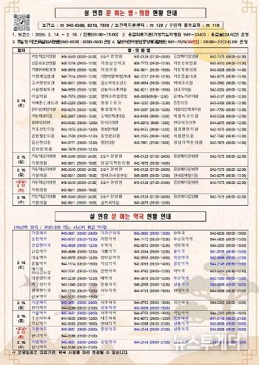 설 연휴 기간 귀성객과 군민의 의료 이용 불편을 최소화하기 위해 응급의료기관의 24시간 응급실 운영, 야간진료실 및 달빛어린이병원 운영과 문 여는 병·의원 및 약국 지정을 통해 응급진료체계를 강화한다.