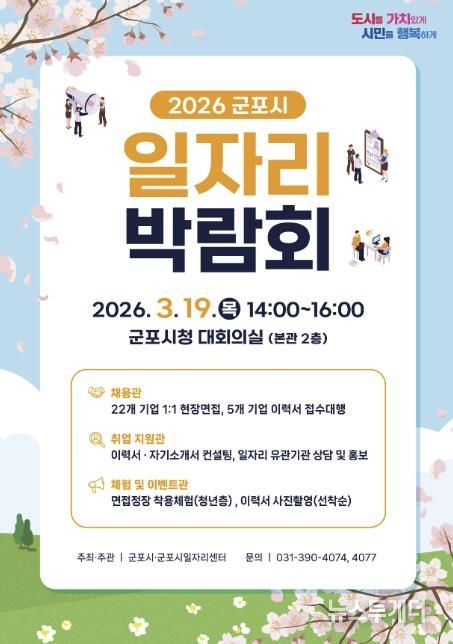 뉴스투게더 김인숙 기자 | 군포시는 오는 3월 19일 오후 2시부터 시청 대회의실에서 ‘2026년 군포시 일자리 박람회’를 개최함에 따라 2월 10일부터 2월 27일까지 박람회에 참여할 기업체를 모집한다.