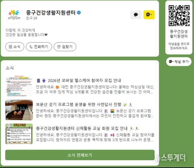 뉴스투게더 김인숙 기자 | 대전 중구는 주민들에게 보다 폭넓고 신속한 건강 정보와 중구건강생활지원센터에서 추진하는 각종 사업 정보를 제공하기 위해 카카오톡 채널을 개설・운영한다고 8일 밝혔다.