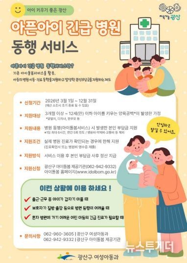 뉴스투게더 김인숙 기자 | 광주 광산구가 3월 1일부터 부모가 곁에 없거나 돌봐주기 어려운 상황에서 갑작스럽게 진료가 필요한 아동을 위한 ‘아픈 아이 긴급 병원 동행’ 서비스를 시행한다.