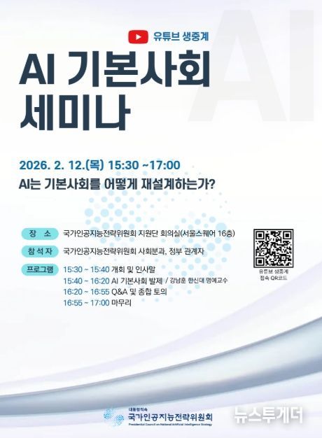 뉴스투게더 김인숙 기자 | 국가인공지능전략위원회는 2월 12일 오후 3시 30분부터 AI 기본사회 세미나를 개최한다. 이번 세미나는 AI 기술 확산이 노동ㆍ복지ㆍ분배ㆍ사회안전망 등 경제ㆍ사회 정책 전반에 미치는 영향을 종합적으로 살펴보고, AI 시대에 부합하는 기본사회 제도 설계 방향에 대한 시사점을 도출하기 위해 마련됐다. 특히 AI 기술의 확산에 따라 부와 생산수단이 특정 주체에 집중됨과 동시에 고용ㆍ소득 양극화를 포함한 구조적 변화가 예상되는 상황에서, 기본사회 정책이 어떤 역할과 방향성을 갖고 추진되어야 하는지에 대한 심도 있는 논의가 진행될 예정이다.