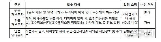 앞으로 주민 대피가 필요한 긴급 상황은 반드시 ‘위급재난문자’ 또는 ‘긴급재난문자’로 발송해 국민께 휴대전화 최대 음량의 알림 소리(40dB 이상 ‘삑’ 소리)로 위험 상황을 알린다.