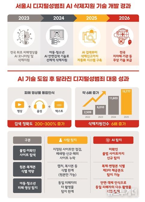 한편, 서울시는 AI 기술 도입 이후 ‘서울 디지털 성범죄 안심지원센터’의 삭제지원 건수가 2022년 2,509건에서 2025년 15,777건으로 4년 만에 6배 이상 증가했다고 밝혔다.