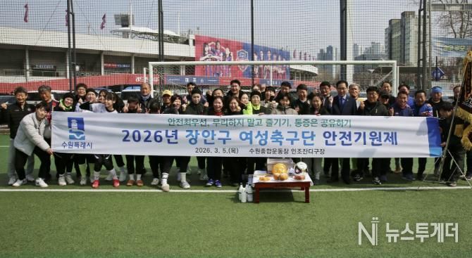 뉴스투게더 김인숙 기자 | 수원시 장안구 여성축구단은 지난 5일, 수원종합운동장 인조잔디구장에서 선수단과 관계자 등 30여 명이 참석한 가운데 2026년 안전기원제를 진행했다.