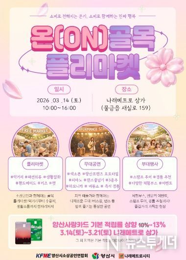 뉴스투게더 김인숙 기자 | 양산시 소상공인연합회(회장 우현욱)에서 골목상권 활성화와 지역 상인들의 판로 확대를 위해‘온(ON)골목 플리마켓’을 3월 14일(토) 나래메트로시티 상가(양산시 골목형상점가 1호), 3월 21일 덕계무지개상점가(양산시 골목형상점가 2호) 인근 덕계2임시 공영주차장에서 개최한다고 밝혔다.