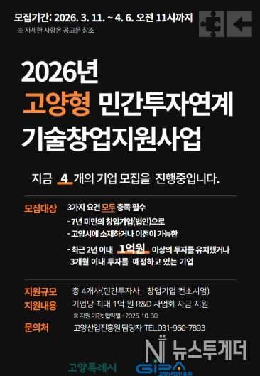 뉴스투게더 이현진 기자 | 고양산업진흥원이 유망 기술창업기업의 투자 유치와 기술 고도화를 지원하기 위한 ‘2026년 고양형 민간투자연계 기술창업지원사업’에 참여할 창업기업을 모집한다.