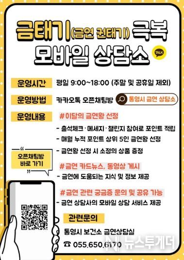 뉴스투게더 김인숙 기자 | 통영시는 금연 시도자들이 겪는 이른바 ‘금태기(금연 권태기)’를 효과적으로 극복할 수 있도록 돕는 ‘모바일 금연 상담소’를 올해 확대 운영한다고 12일 밝혔다.