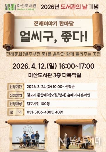 뉴스투게더 김인숙 기자 | 김포시 마산도서관은 제4회 도서관의 날을 맞아 오는 4월 12일 오후 4시부터 5시까지 마산도서관 3층 다목적실에서 전래이야기 한마당 '얼씨구, 좋다!'를 운영한다.